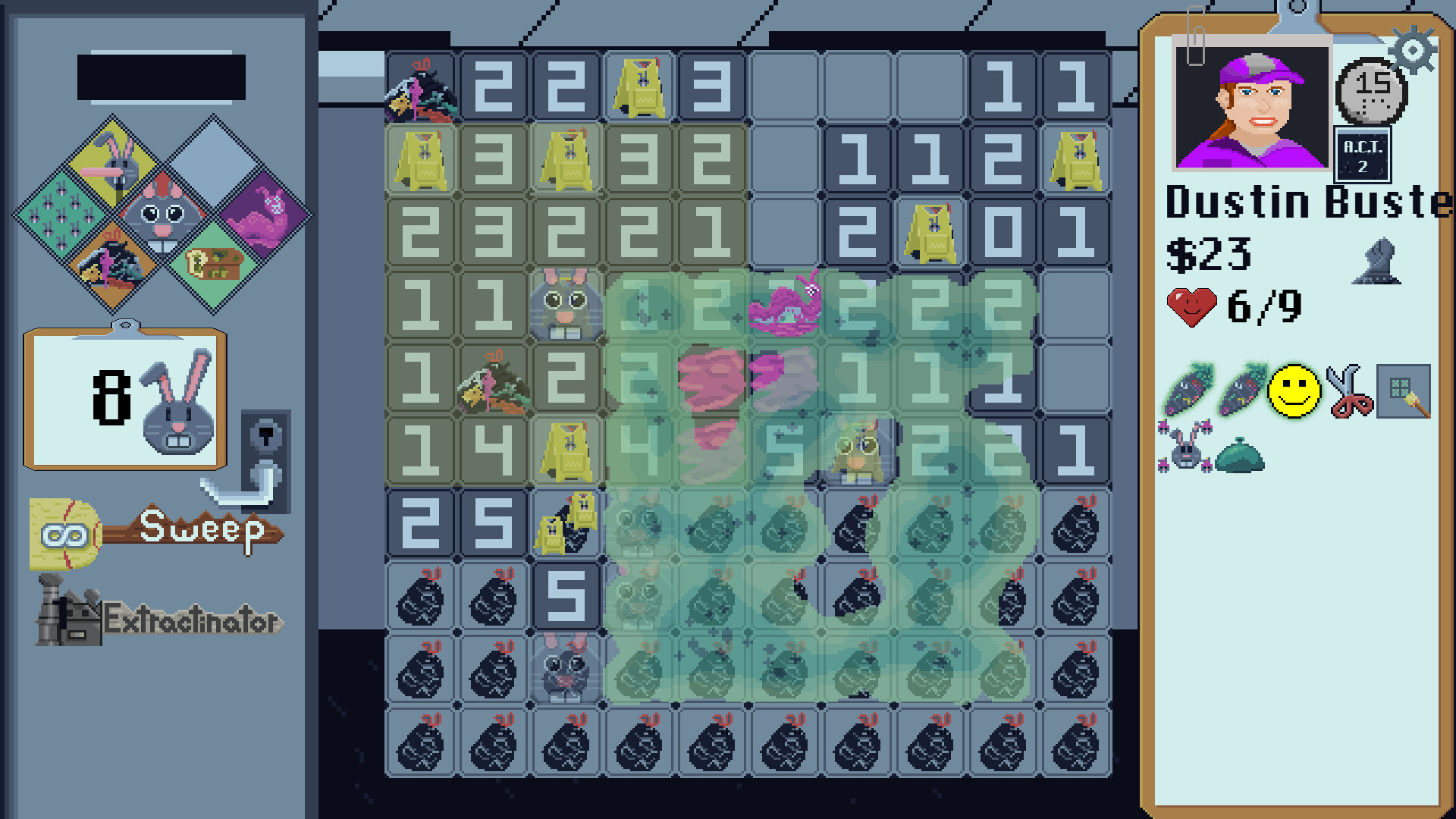 And, of course, the game lets you level the playing field a bit too. Each office cleaned earns you some cash, which you can spend at vending machines to acquire useful items, from a cheque that lets you bribe bunnies into leaving to an upgraded broom that makes your first click also reveal all four corners of the grid.